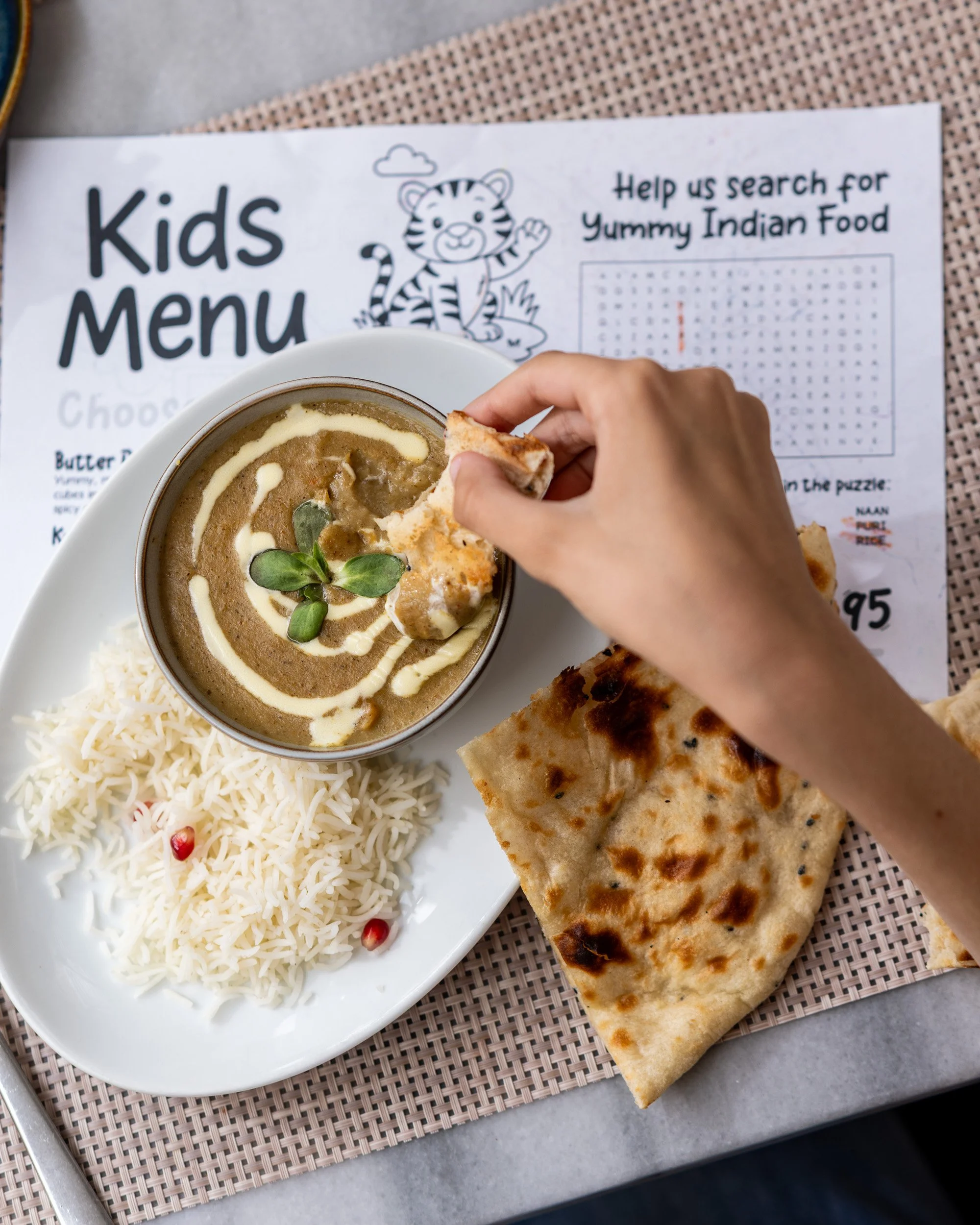 Our new menu is designed to be delicious and fun. We have everything from the mild and creamy Butter Paneer to the not-so-spicy Korma Chick'n. For those who like to try a bit of everything, the Plain Dosa with tasty dips is perfect for dunking and sharing. And for a comforting choice, our Makhani Daal is a big hug in a bowl. Each meal is a chance for your little ones to explore new flavours in a fun way.